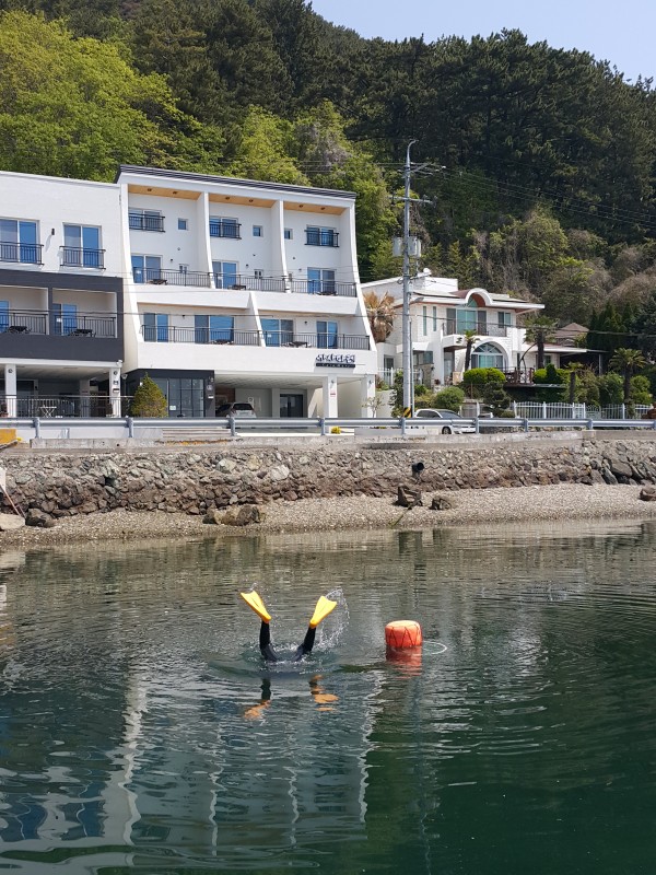 4월28일 오후,  따스한 봄날을 맞아 어느 한 해녀할머니가 까사마레 펜션 앞마다에서 자맥(잠수)질을 하고있네요.