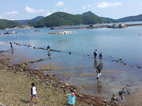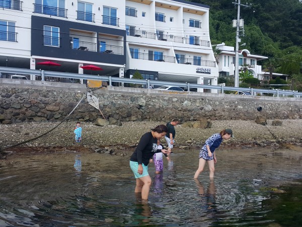 8월 10일 토요일 오후, 까사마레 펜션을 찿은 손님들이 때마침 간조때라 펜션앞바다의 바닷물이